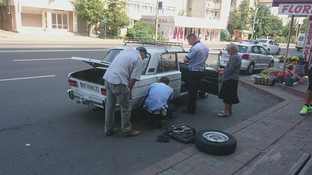 Doi poliţişti din Piatra Neamţ au ajutat un bătrân cu Lada să schimbe o roată