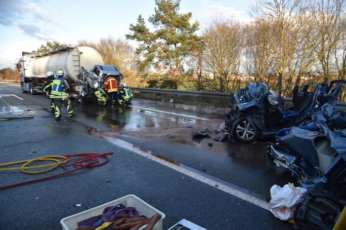 Două autoturisme au fost strivite între două camioane, pe o autostradă din Germania. Sunt mai mulţi morţi şi răniţi