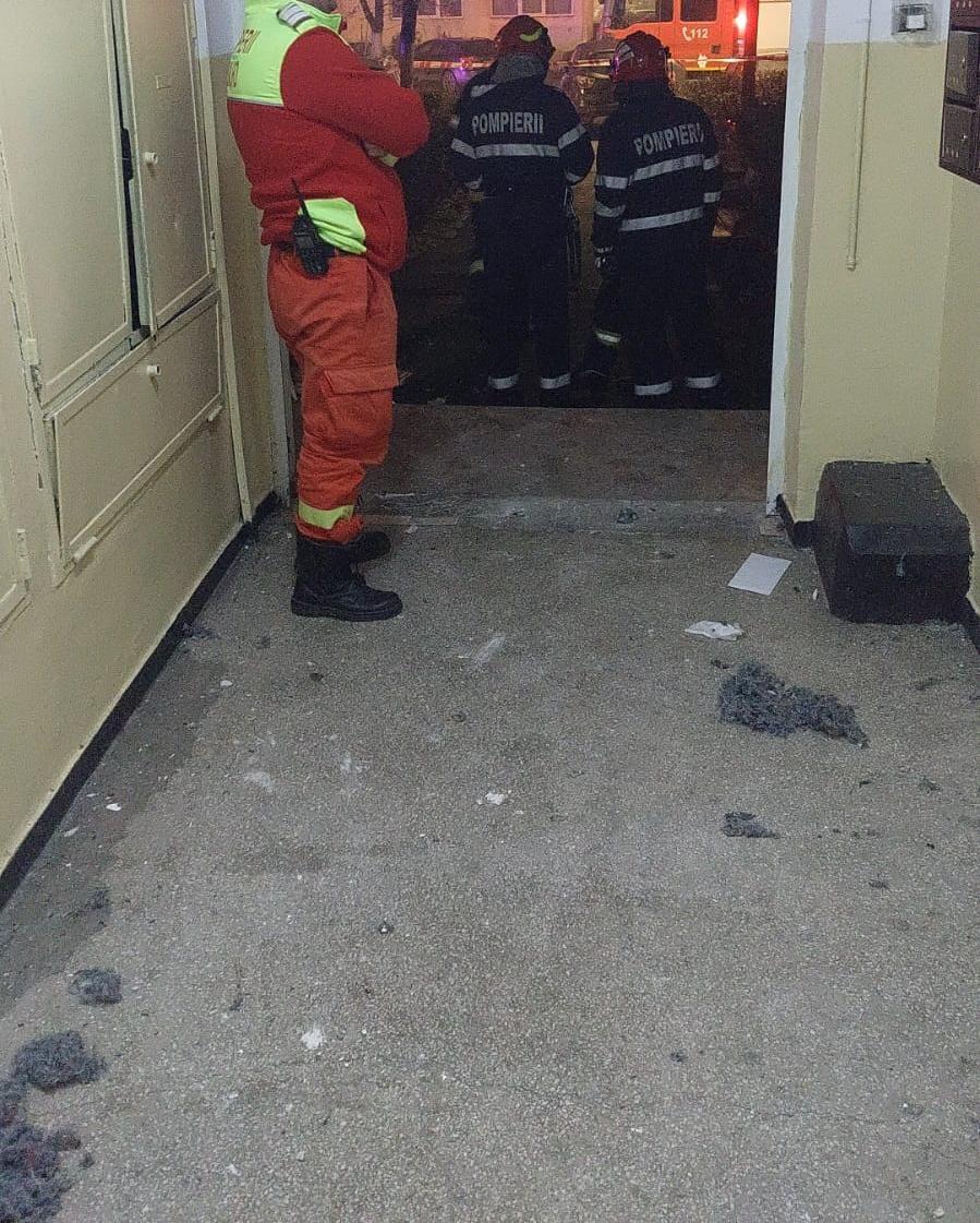 Explozie puternică într-un apartament din Piteşti. Uşa de la intrare în bloc a zburat câţiva metri în urma deflagraţiei