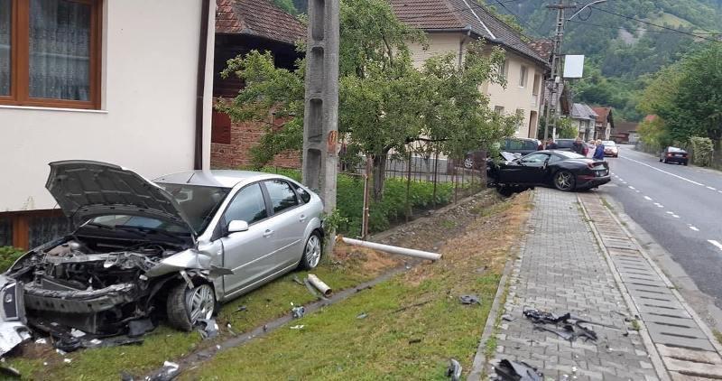 Ferrari distrus la Șugag, în Alba. Șoferul a spulberat un Ford staționat și s-a oprit în gard