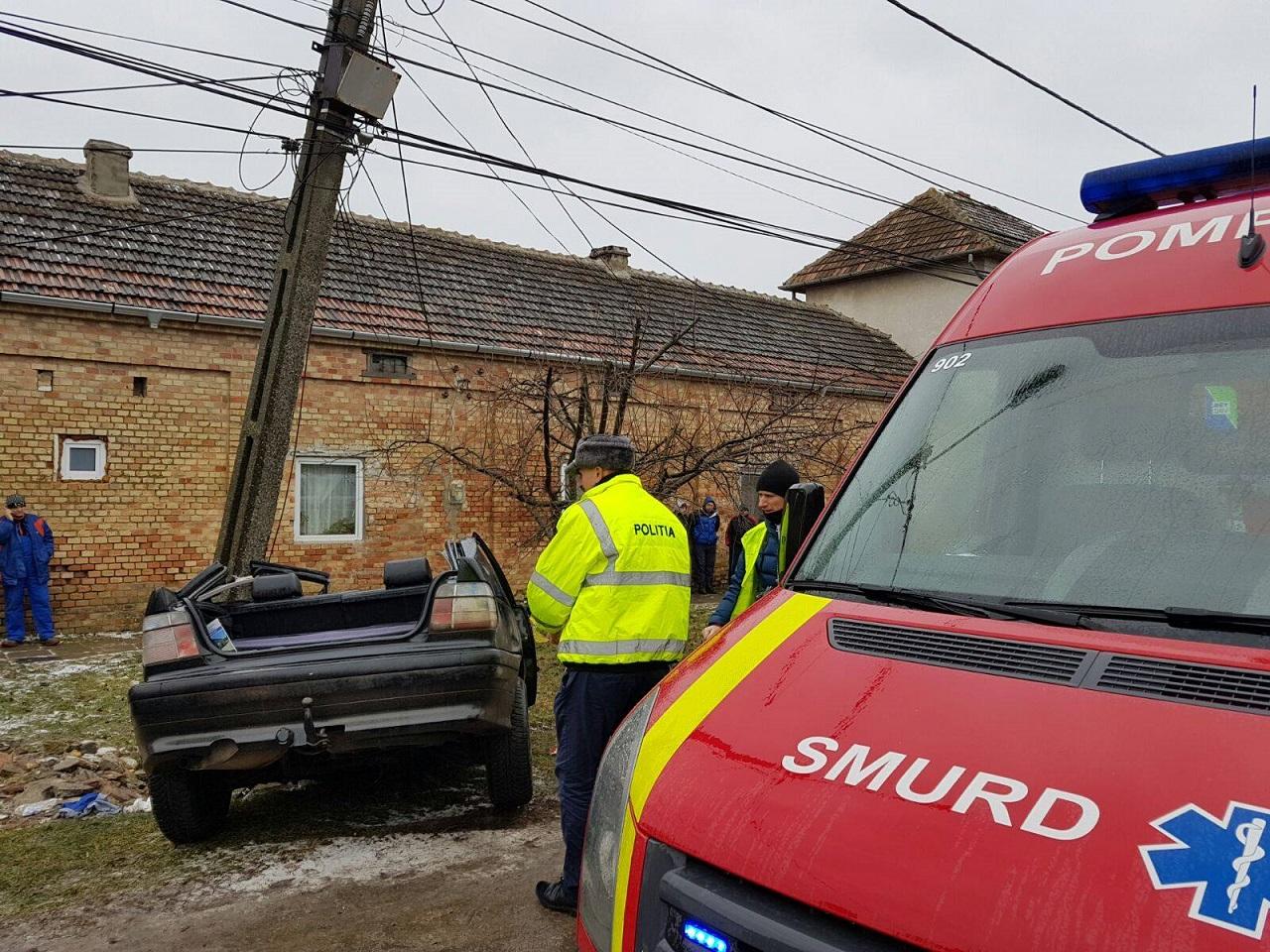 FOTO Accident cumplit în Timiş. O tânără de 26 de ani a murit, după ce a izbit un stâlp cu maşina