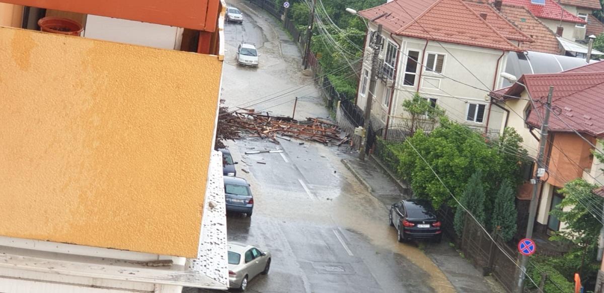 O furtună puternică a lovit la Curtea de Argeş. Vântul a smuls bucăţi din acoperişurile blocurilor (Video)