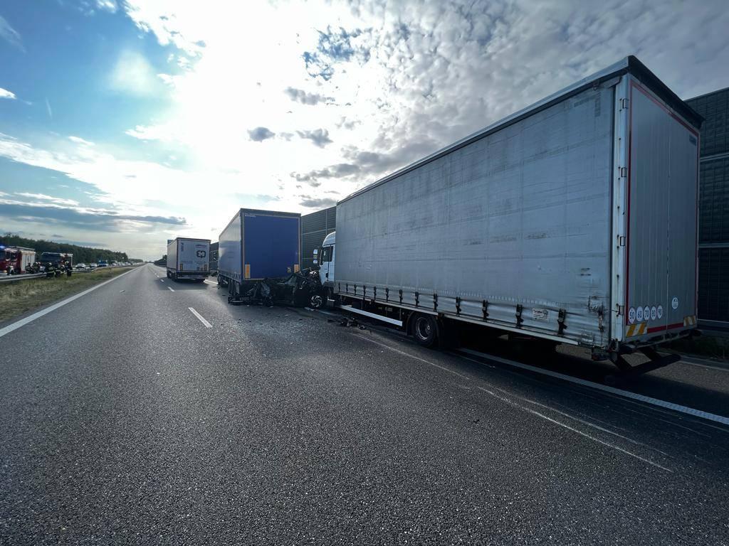 Hyundai făcut bucăți, zdrobit între două TIR-uri, pe autostradă. Imagini de groază pe A2, în Polonia