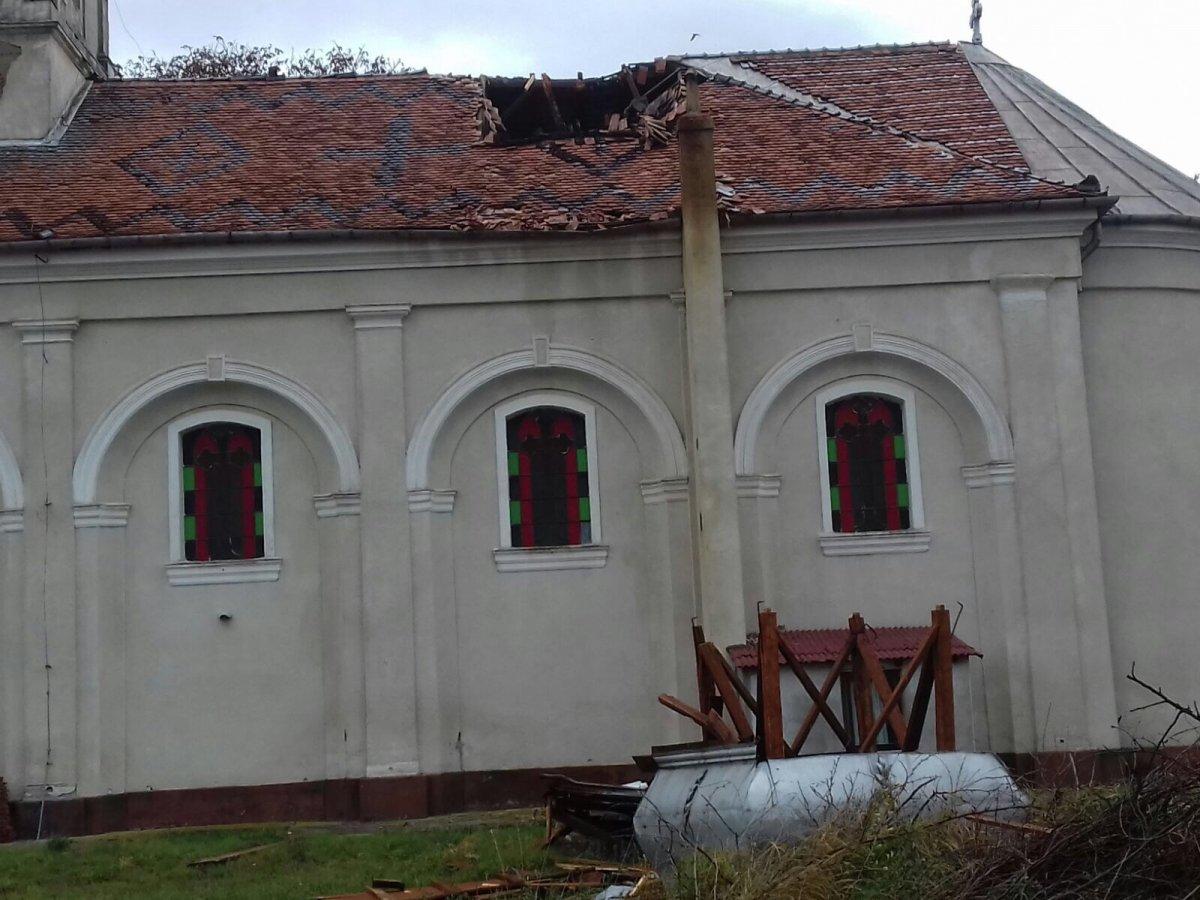 IMAGINI DE COŞMAR în Arad! Catedrala a rămas fără CRUCE, iar o biserică monument stă să se PRĂBUŞEASCĂ. Vântul a dislocat turla, iar crucea a pătruns prin acoperiş
