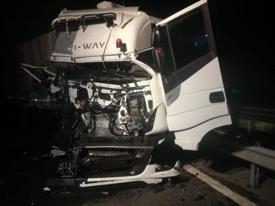 Imagini cumplite pe autostradă, la Nădlac. Un şofer de TIR e în comă, cabina strivită de alt camion