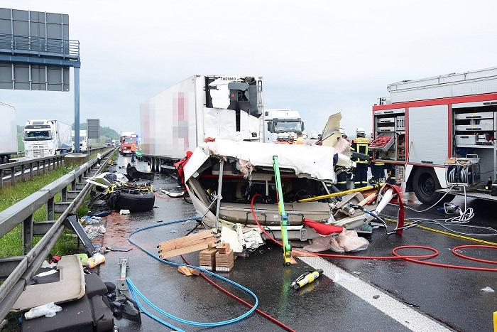 Imagini de groază pe o autostradă din Germania. Un şofer de TIR ar fi aţipit la volan şi a intrat în camionul din faţa lui (video)