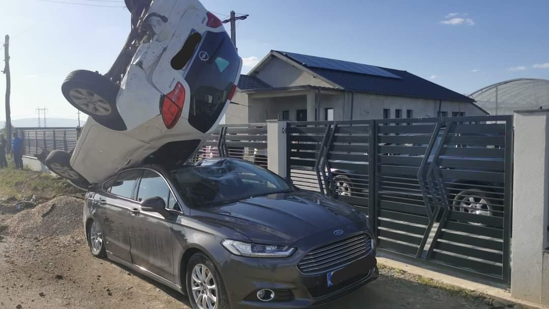 Imagini greu de explicat la Vânători, în Vrancea. Un Opel a rămas suspendat pe plafonul unui Ford, în perfect echilibru, după ce a lovit o grămadă de pietriş