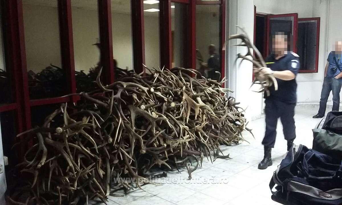 IMAGINI INCREDIBILE! Un cetăţean străin a încercat să scoată din ţară 680 de COARNE DE CERB. Poliţiştii au fost şocaţi
