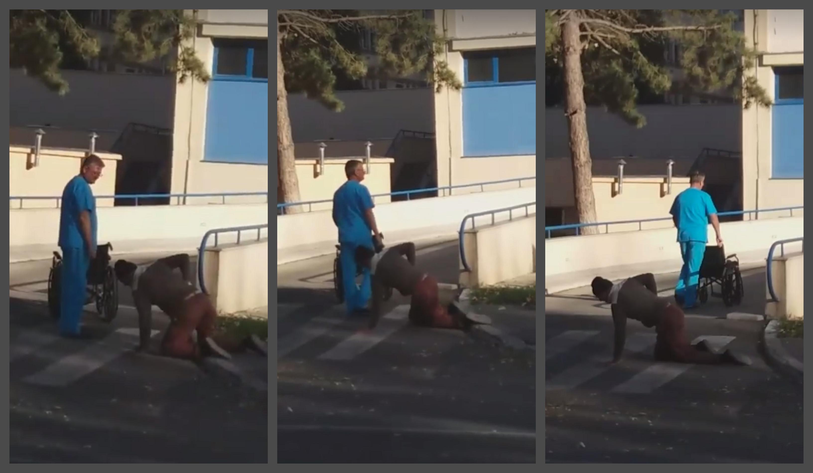 Imagini șocante în fața Spitalului de Urgență Călărași! Un bărbat se târăște în genunchi din spital, după ce a fost externat