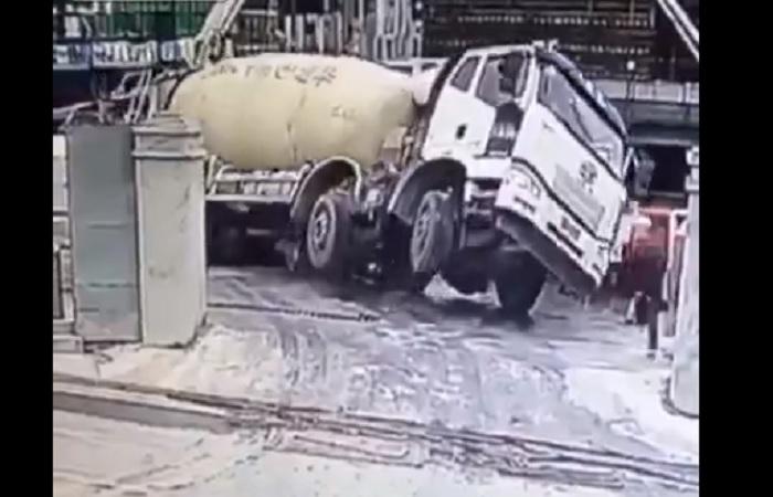 Imagini șocante! Un camion cu ciment cade într-o gaură apărută din senin, sub privirile disperate ale constructorilor (VIDEO)