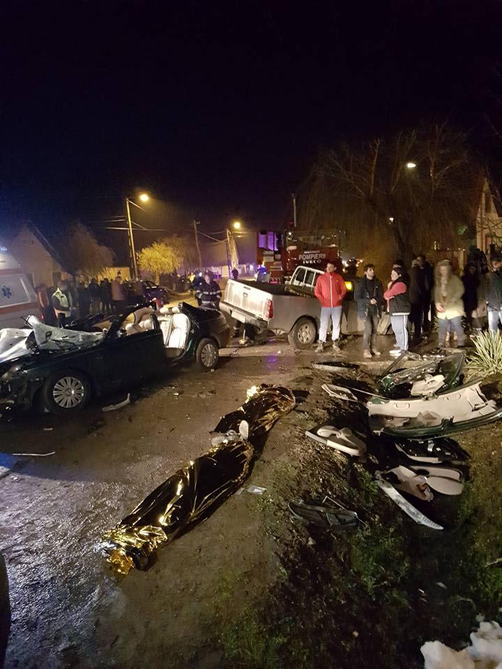 IMAGINI TERIBILE de la un accident rutier, în Arad: 2 tineri morți, 6 răniți grav, după ciocnirea frontală a două mașini