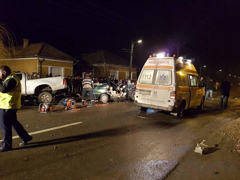 IMAGINI TERIBILE de la un accident rutier, în Arad: 2 tineri morți, 6 răniți grav, după ciocnirea frontală a două mașini