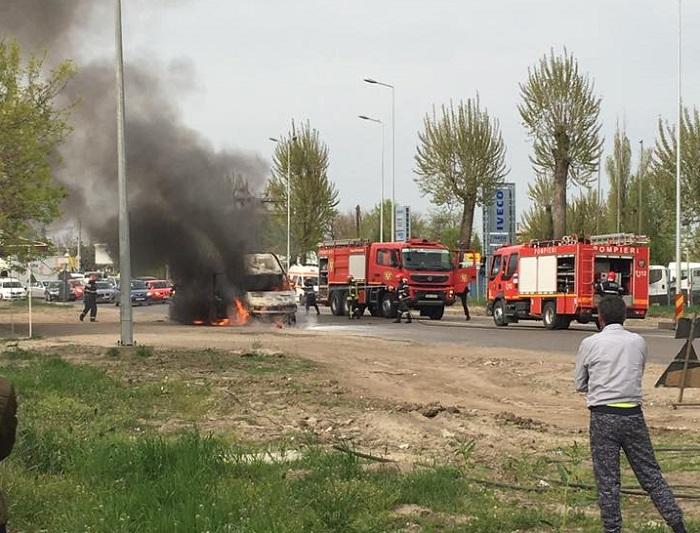 Imagini teribile. Un microbuz de pe linia 572 a luat foc pe Şoseaua Giurgiului. Traficul e complet oprit
