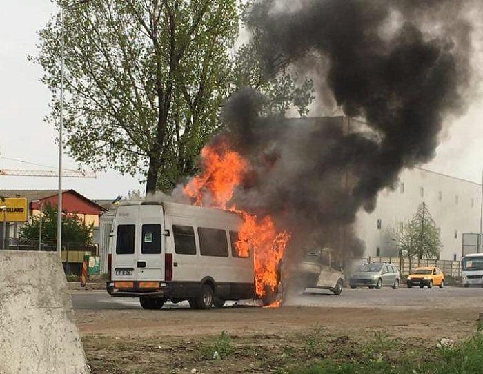 Imagini teribile. Un microbuz de pe linia 572 a luat foc pe Şoseaua Giurgiului. Traficul e complet oprit