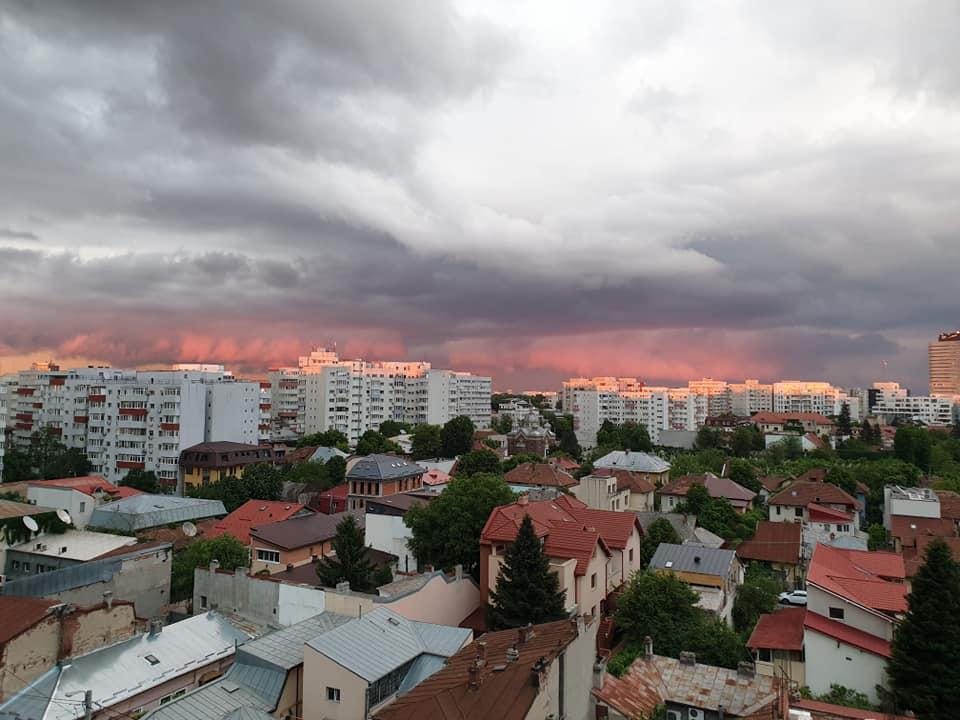 Imagini unice cu norii roz de furtună care au acoperit Bucureștiul luni seara