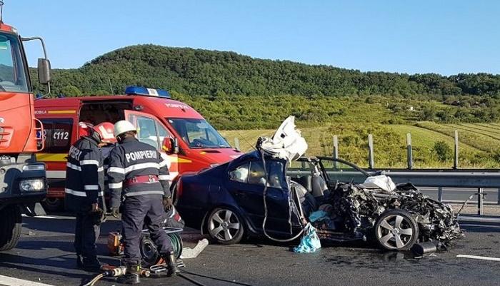 IMPACT nimicitor pe A1, la Sibiu! Un autoturism s-a izbit violent de un TIR. Trei persoane au ajuns la spital. IMAGINI de la locul acidentului