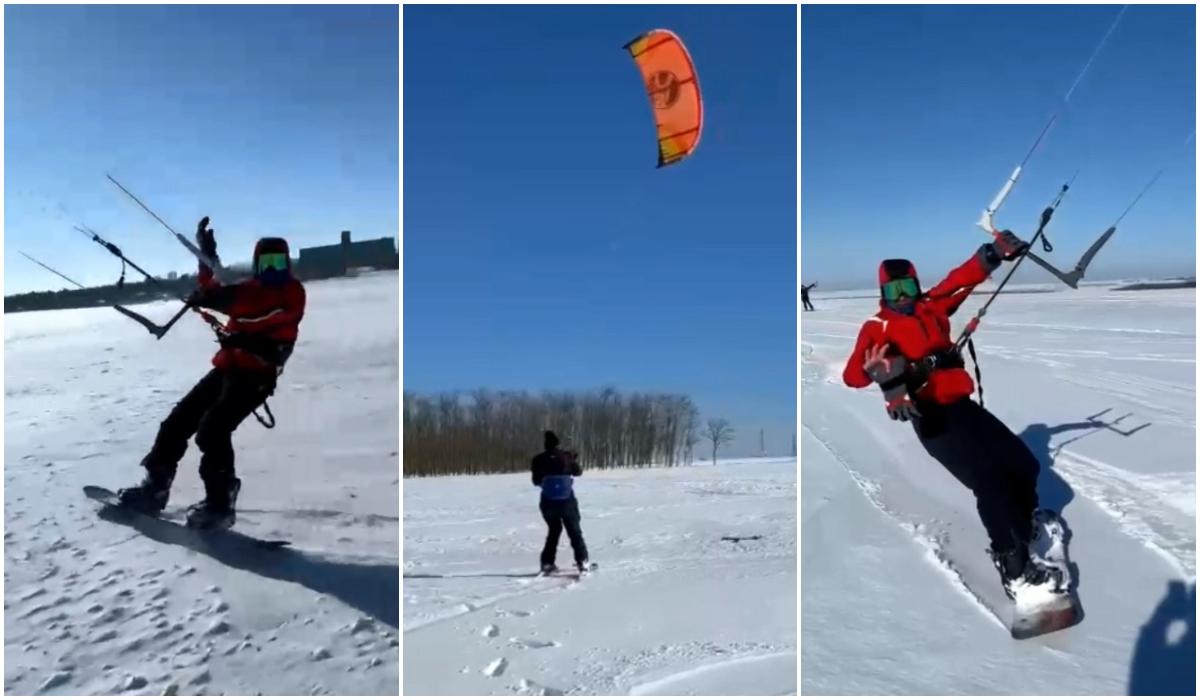 Împătimiţii de sporturi nautice au dat valurile pe nămeţi, la Constanţa. Tinerii s-au dat cu placa de surf pe un câmp înzăpezit
