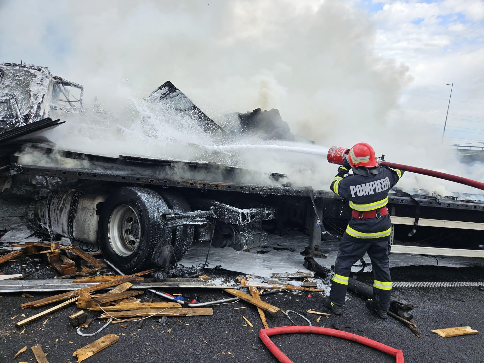 Incendiu puternic pe Autostrada A10 Sebeş – Alba Iulia, după ce un camion a explodat în mers şi s-a oprit într-un parapet. Traficul a fost blocat aproape o oră | Imaginea 3 din 6 | Galerie Foto