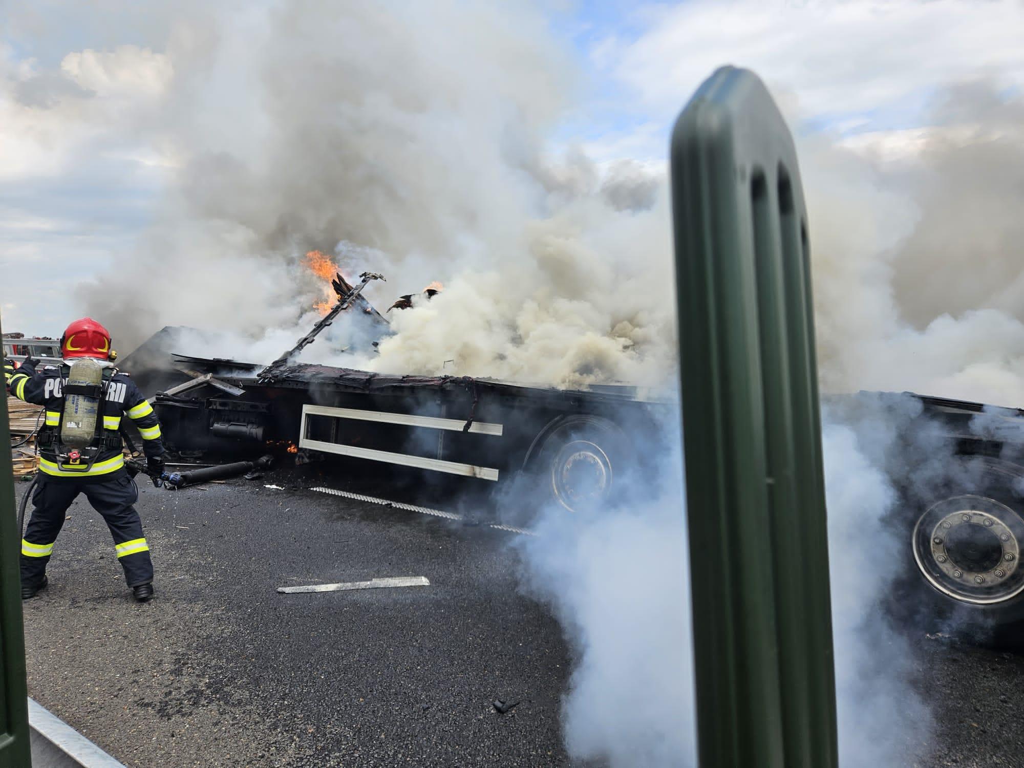 Incendiu puternic pe Autostrada A10 Sebeş – Alba Iulia, după ce un camion a explodat în mers şi s-a oprit într-un parapet. Traficul a fost blocat aproape o oră | Imaginea 5 din 6 | Galerie Foto