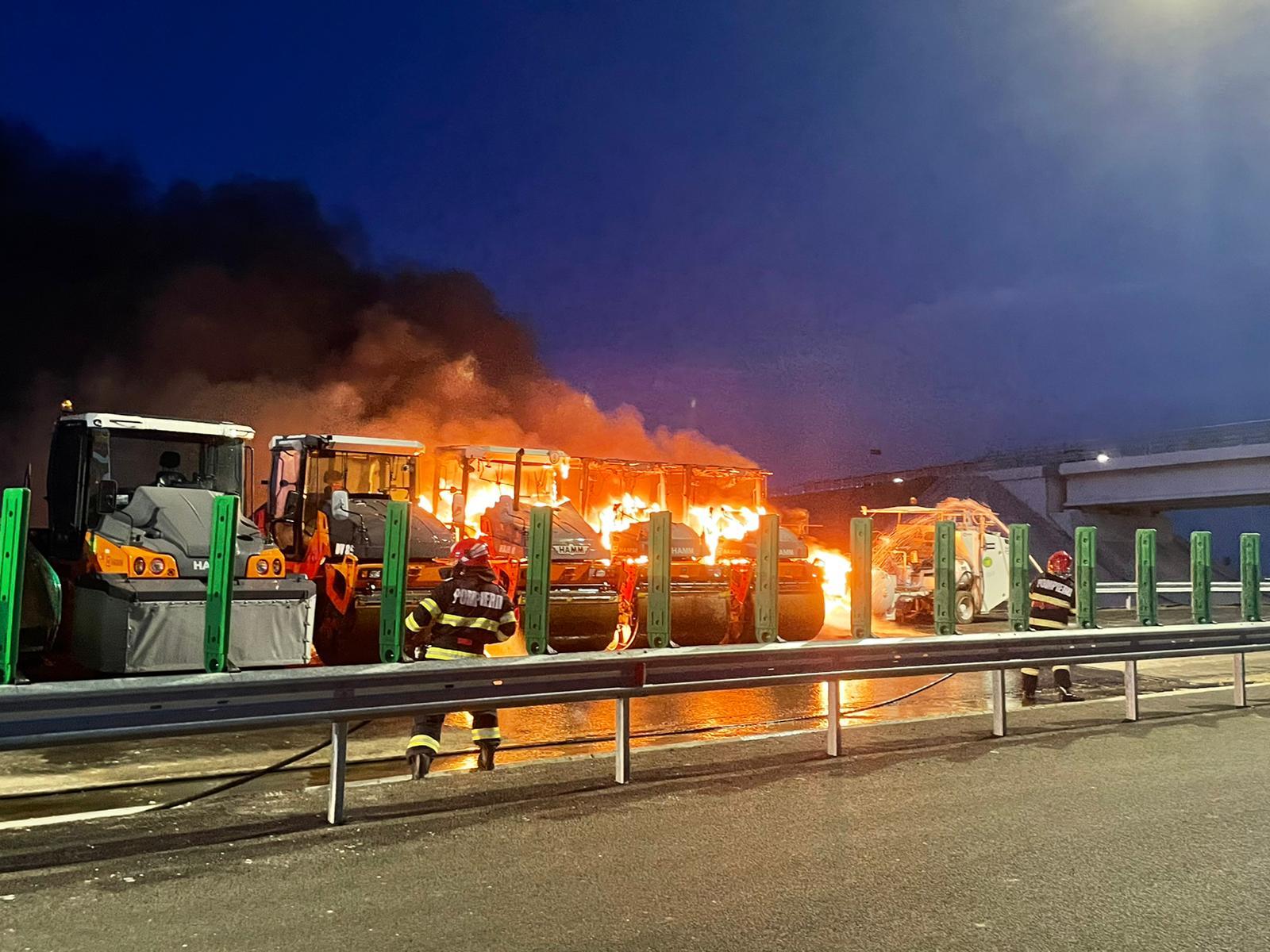 Incendiu uriaş pe şantierul drumului expres Craiova-Piteşti: Patru utilaje, distruse în proporţie de 70% după ce au luat foc