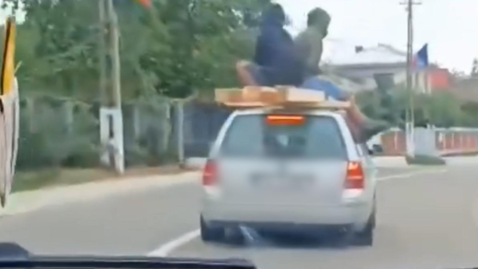 Inconştienţă fără limite: Doi bărbaţi, filmaţi pe plafonul unei maşini aflate în mers, în Suceava. Se sprijineau de nişte lemne