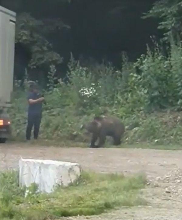 Inconştienţă maximă: Un turist s-a apropiat cu telefonul de un urs aflat pe marginea drumului, în Covasna