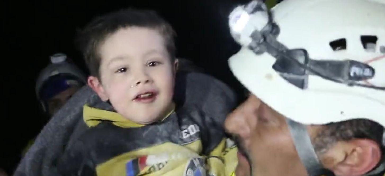 Inocența copilăriei: Abia scos de sub dărâmături, Karam, un băiețel din Siria le-a zâmbit salvatorilor și a început să se joace cu ei
