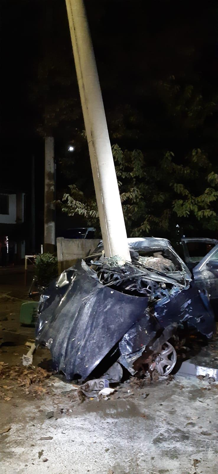 Jaguar despicat de un stâlp la Suceava, trei tineri au scăpat teferi din maşina descompusă