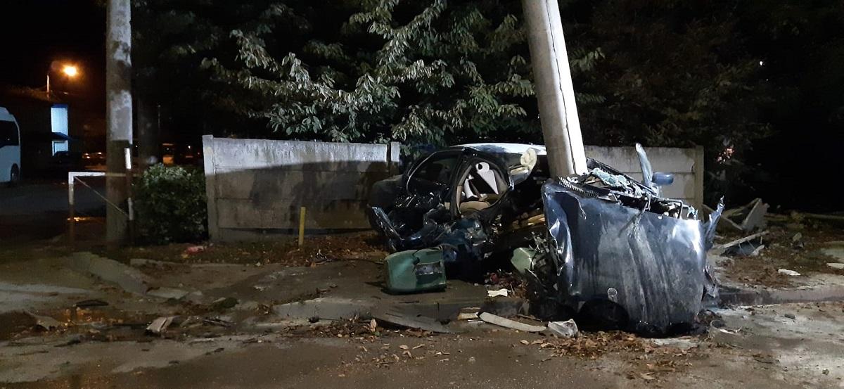 Jaguar despicat de un stâlp la Suceava, trei tineri au scăpat teferi din maşina descompusă