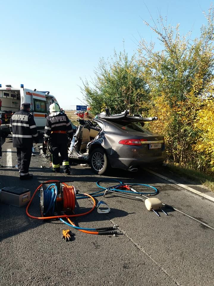 Jaguar distrus la Şimand, în Arad, a intrat frontal într-un TIR. A fost chemat elicopterul SMURD