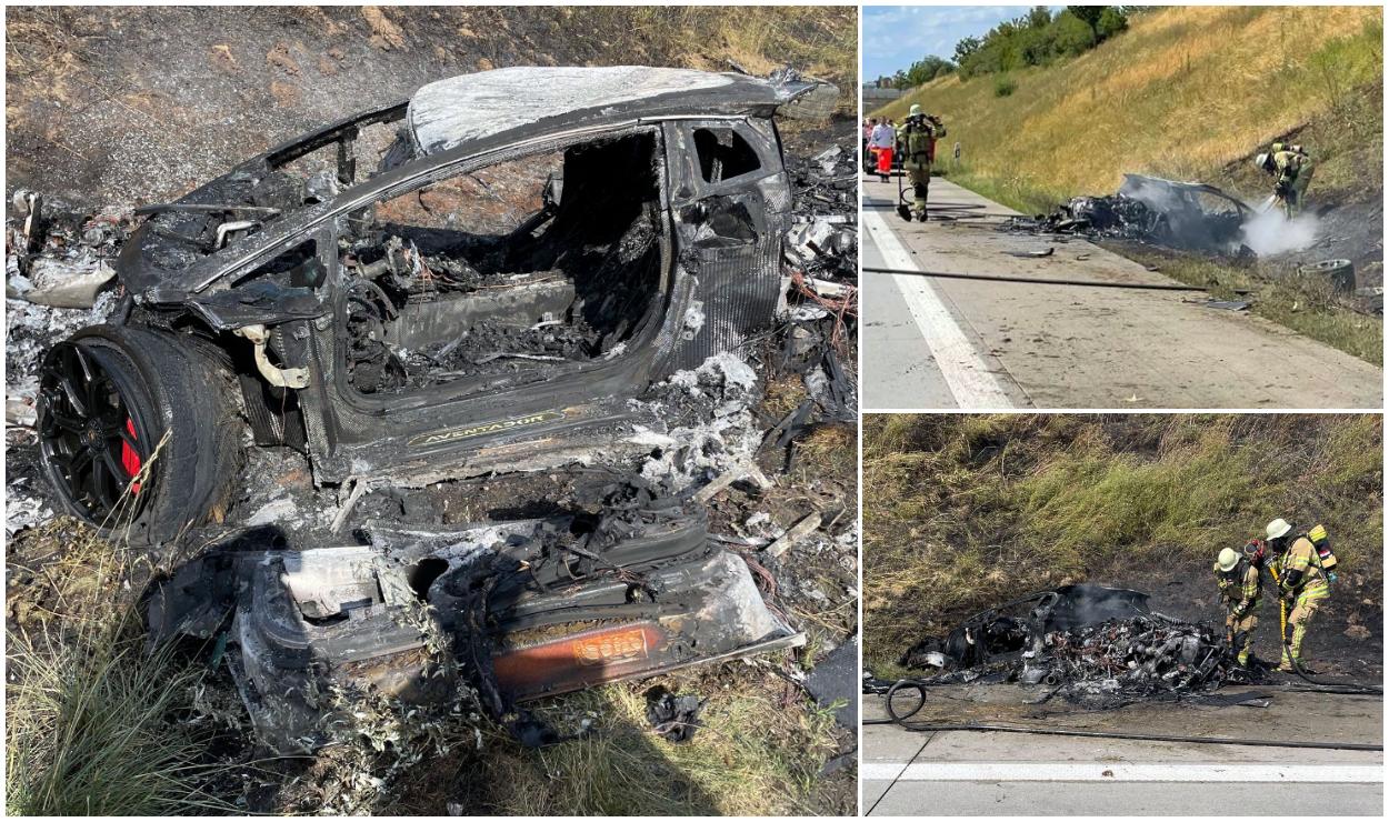 Lamborghini Aventador în flăcări, după o cursă nebună cu peste 200 de km/oră. Bolidul s-a făcut scrum pe autostrada A8 din Germania | Imaginea 1 din 5 | Galerie Foto
