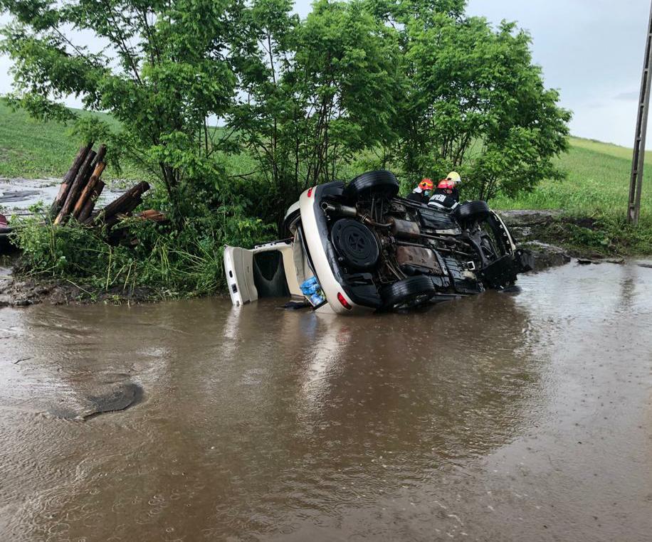 Lexus înfipt în noroiul de pe marginea drumului, în Bistrița