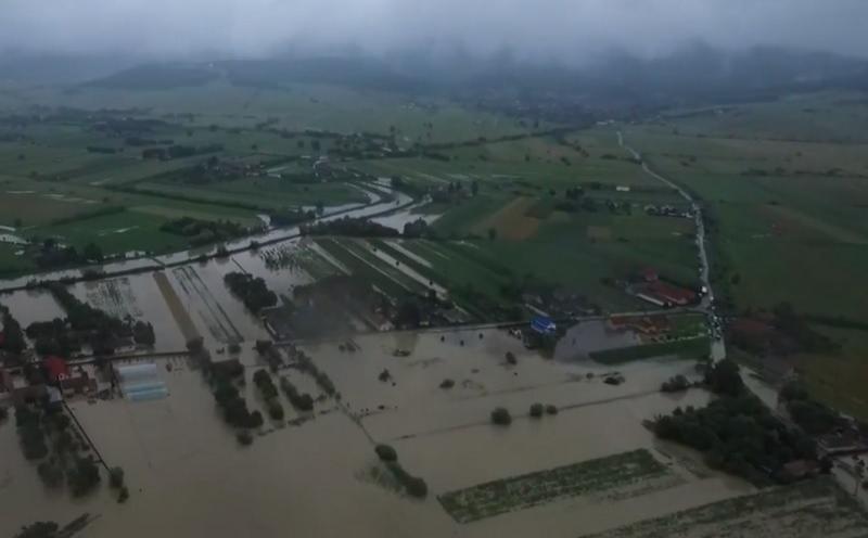 Inundații devastatoare în Covasna. Un sat întreg a fost acoperit de ape după ce digul de protecție a cedat. Video dronă