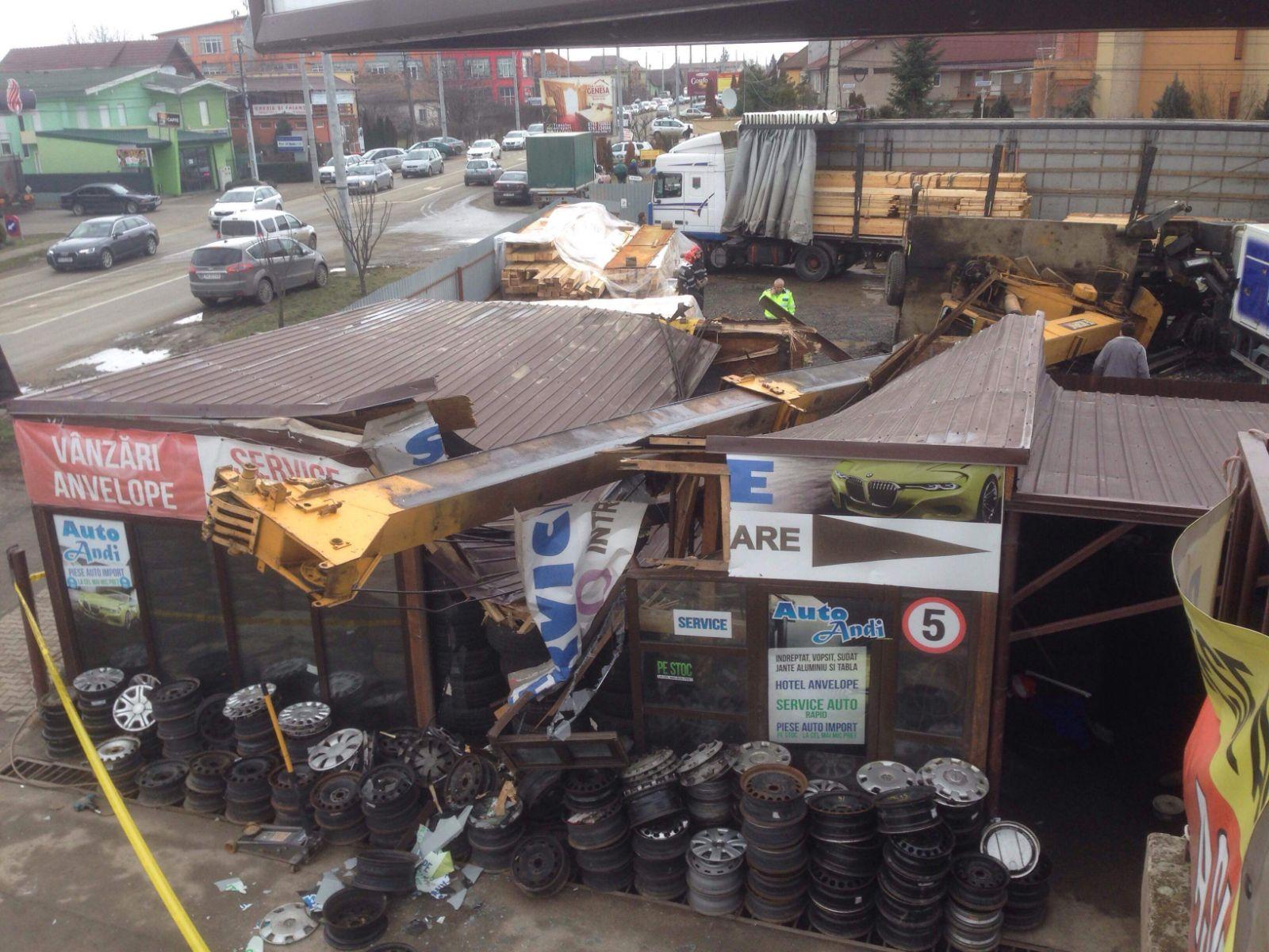 Accident grav în Timişoara. O macara s-a prăbuşit peste un service auto (Foto)