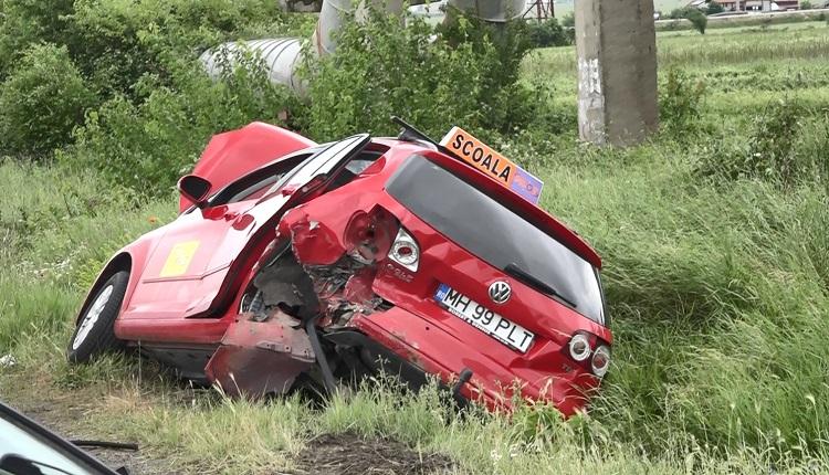 Maşină de şcoală, făcută praf în Mehedinţi. Tânăra elevă de la volan şi instructorul au fost spulberaţi de un şofer neatent: "Efectiv nu i-am văzut..." (Video)