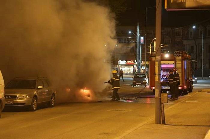 Panică lângă autogara Bacău. Flăcări uriaşe au cuprins o maşină. Şoferul abia coborâse de la volan