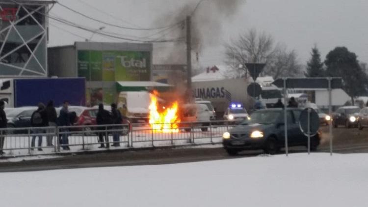 Maşină în flăcări, într-o intersecţie din Bascov! O dubiţă a luat foc în timpul mersului, intervin pompierii (Video)