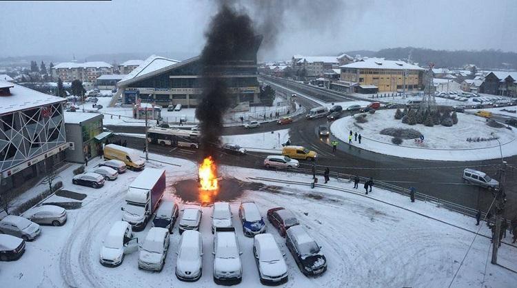 Maşină în flăcări, într-o intersecţie din Bascov! O dubiţă a luat foc în timpul mersului, intervin pompierii (Video)