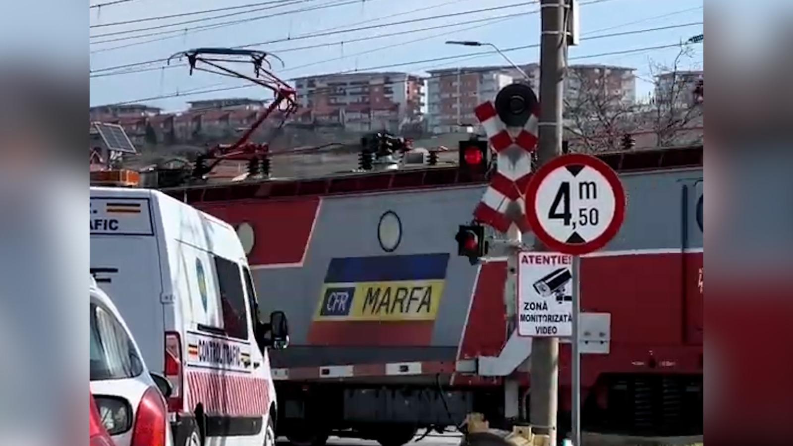 Mașina inspectorilor de la ISCTR Cluj, prinsă sub barieră, după ce șoferul a forțat trecerea de cale ferată de la Apahida. La scurt timp a trecut și trenul