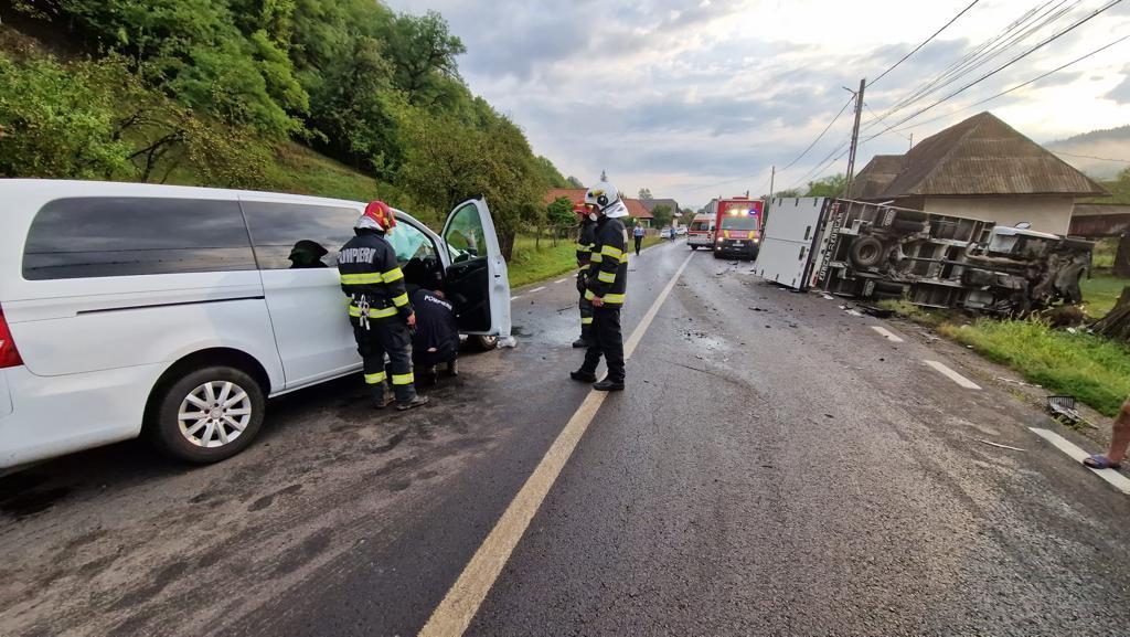 Microbuz cu 2 adulţi şi 7 copii, accident de groază cu un TIR şi o dubă, în Bacău. Mai multe ambulanţe s-au deplasat la faţa locului