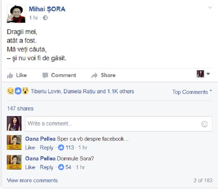 Mihai Şora, mesaj de despărţire pe pagina de Facebook! Admiratorii săi sunt neliniştiţi!