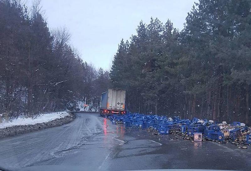 Mii de sticle cu bere, împrăştiate pe şosea, la Bacău, Dealul Măgura. S-au rupt stâlpii de susţinere ai încărcăturii