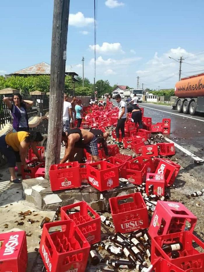 Mii de sticle de bere pe şosea, la Ion Luca Caragiale. Un TIR a pierdut pe drum toată încărcătura