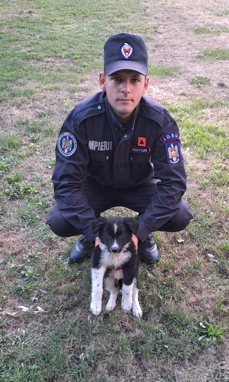 Misiune cu final fericit în Neamţ. Căţel salvat de pompieri, după ce s-a blocat pe râul Roman. Acesta a fost adoptat chiar de salvator