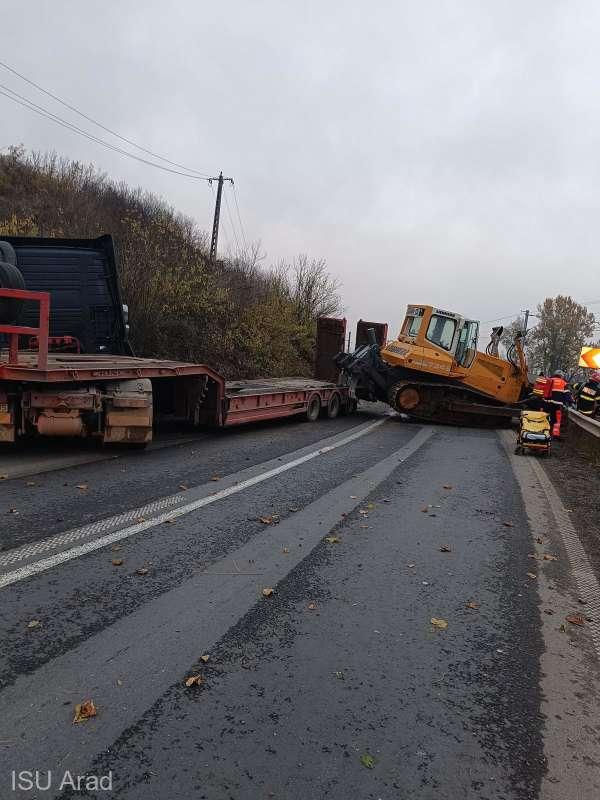 Moarte înfiorătoare pentru o tânără de 24 de ani. A fost strivită în autoturism, după ce un excavator a căzut de pe trailer, în Arad. O altă fată, în stare gravă | Sursa foto: ISU Arad