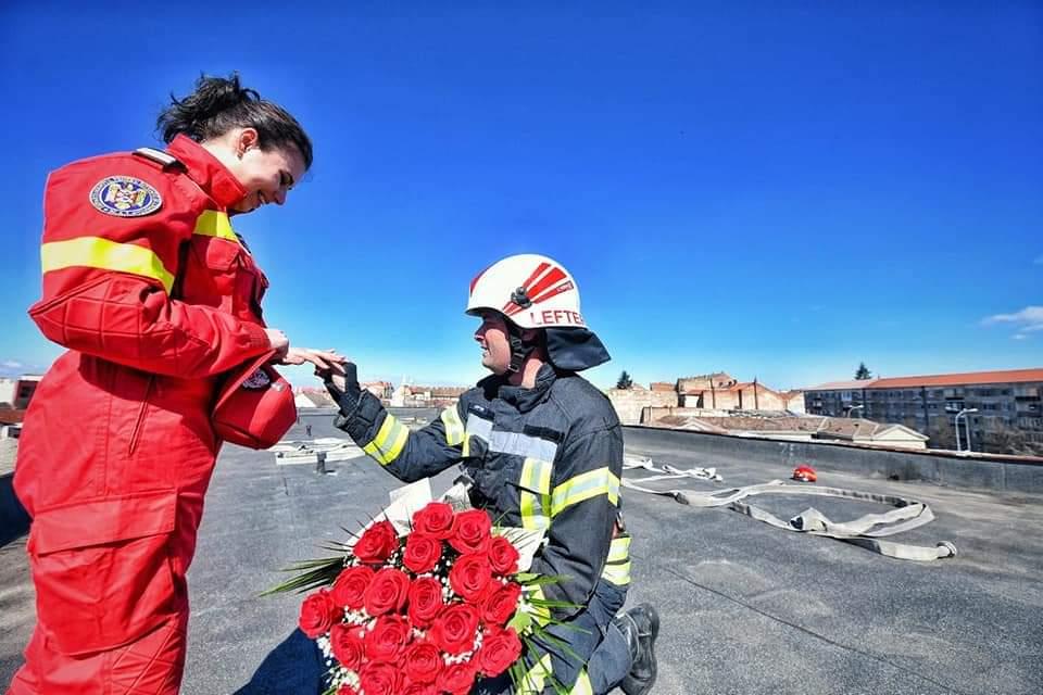 Pompierul a îngenunchiat și a cerut-o pe iubita sa de soție | Sursa foto: ISU Timiș