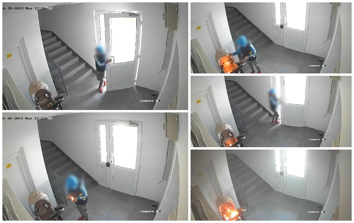Momentul când un copil de 9 ani provoacă un incendiu într-un bloc din Tecuci. Nu s-a lăsat până nu a aprins căruciorul de pe hol | Imaginea 2 din 9 | Galerie Foto
