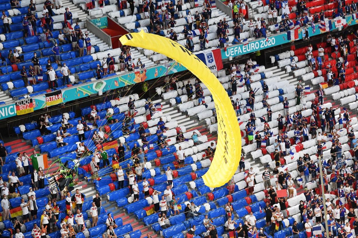 Momentul care nu s-a văzut la TV. Un activist Greenpeace a aterizat pe teren înainte de Franţa - Germania după ce s-a încurcat în cablurile camerelor TV - VIDEO