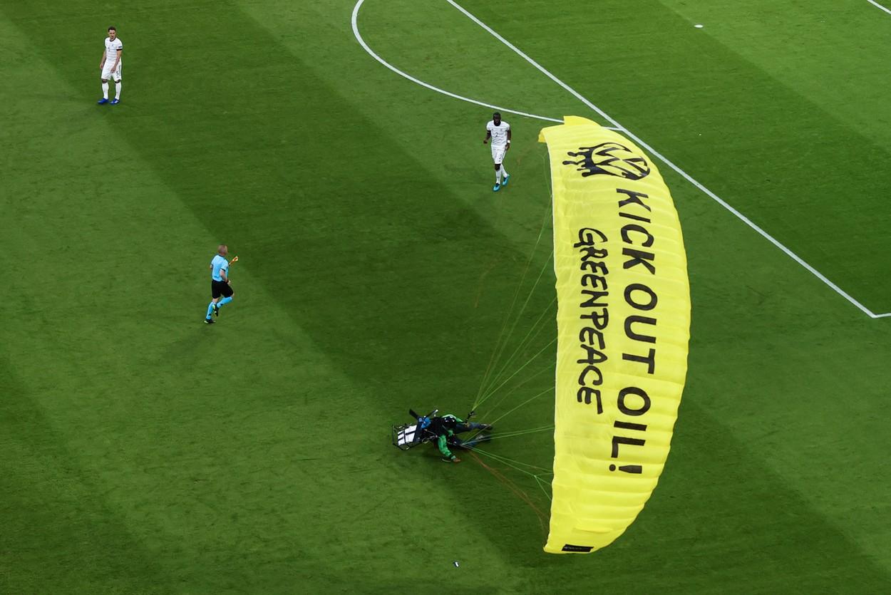 Momentul care nu s-a văzut la TV. Un activist Greenpeace a aterizat pe teren înainte de Franţa - Germania după ce s-a încurcat în cablurile camerelor TV - VIDEO