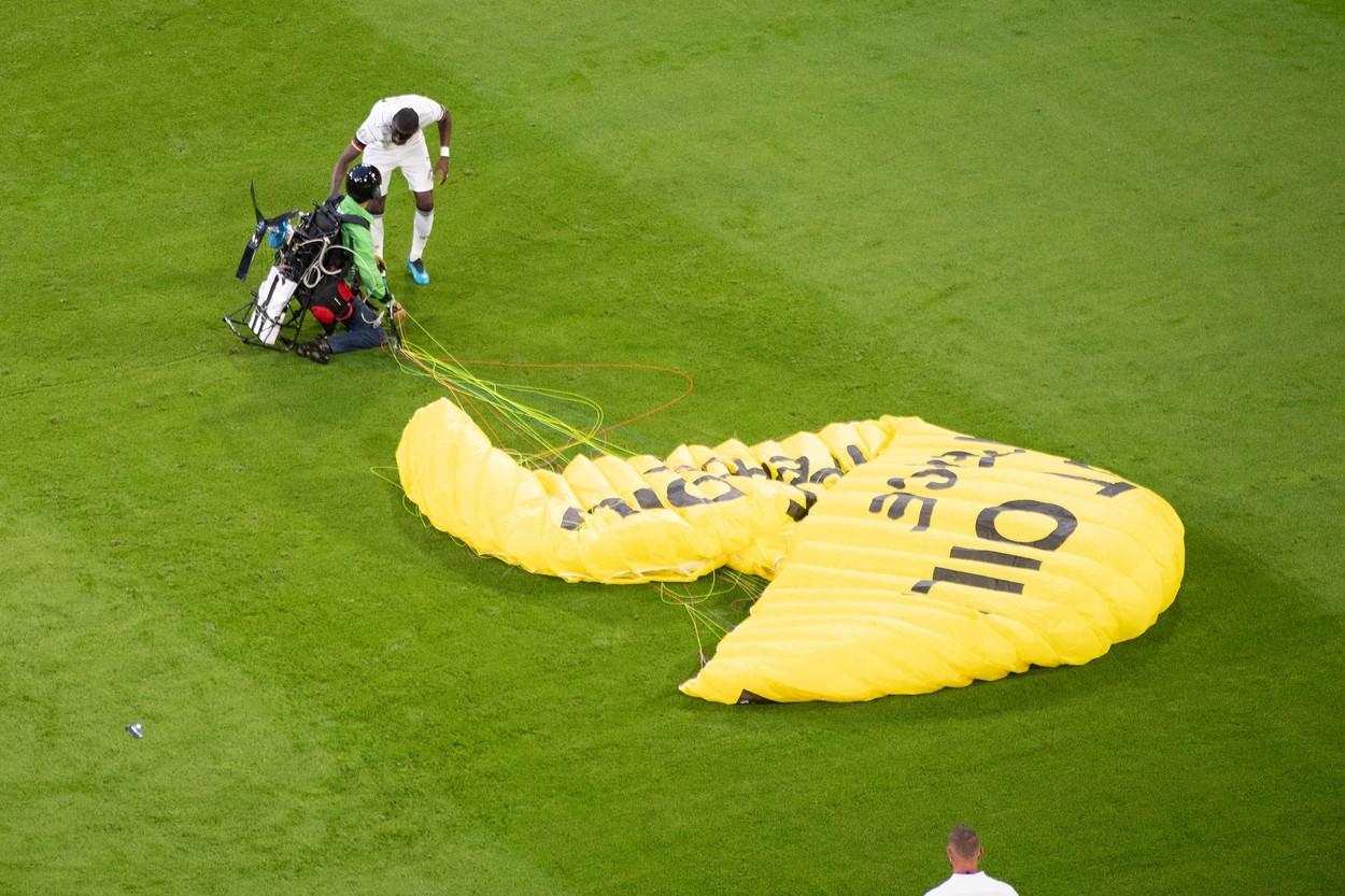 Momentul care nu s-a văzut la TV. Un activist Greenpeace a aterizat pe teren înainte de Franţa - Germania după ce s-a încurcat în cablurile camerelor TV - VIDEO